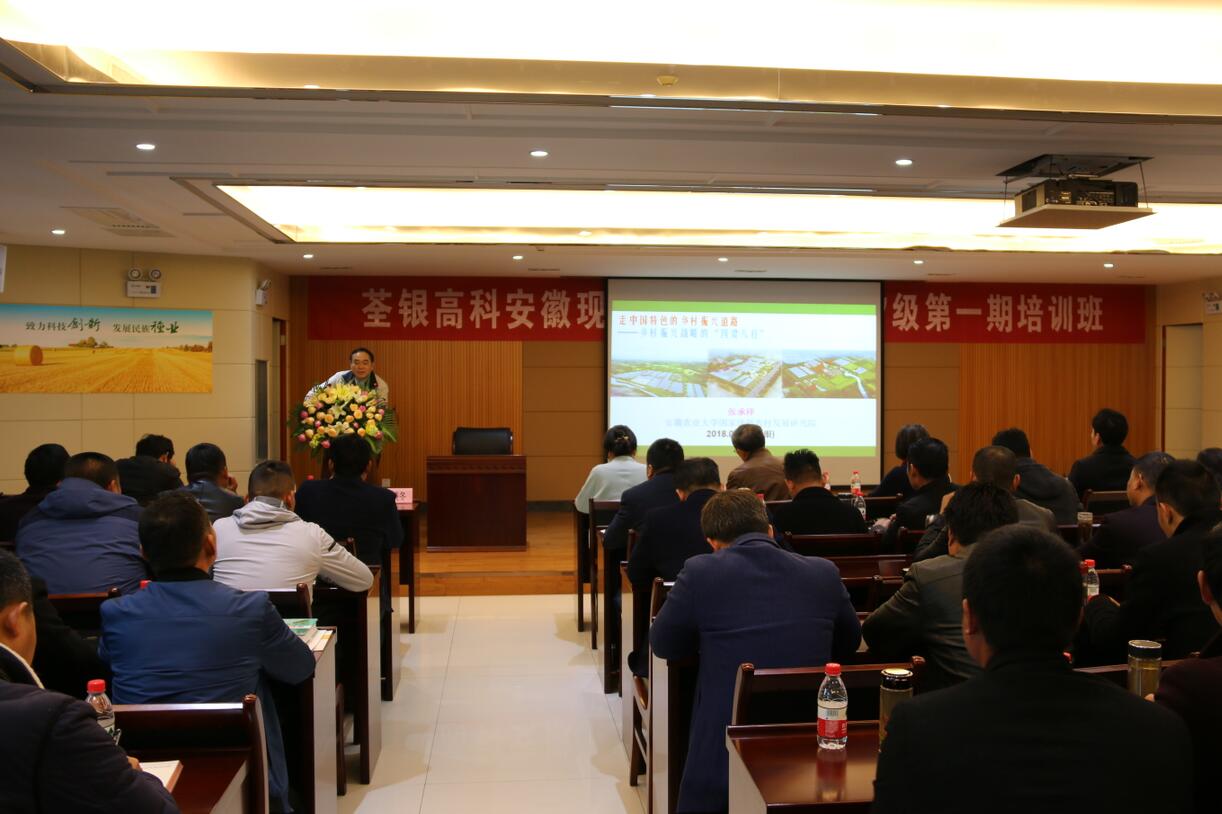 ? ? 本次培訓(xùn)班由安徽省農(nóng)委主辦、荃銀高科承辦,集中培訓(xùn)時(shí)間為3月18日至22日,主要培訓(xùn)課程有水稻規(guī)模生產(chǎn)管理技術(shù)、水稻育種及品種選用、社會(huì)化服務(wù)組織對接、小麥規(guī)模生產(chǎn)管理技術(shù)、新型職業(yè)農(nóng)民職業(yè)素養(yǎng)、現(xiàn)代農(nóng)業(yè)創(chuàng)業(yè)等。3月18日上午,安徽農(nóng)業(yè)大學(xué)新農(nóng)村發(fā)展研究院張承祥教授為學(xué)員開講“鄉(xiāng)村振興戰(zhàn)略”主題課。在學(xué)習(xí)培訓(xùn)期間,除了理論課程,農(nóng)場主學(xué)員們將于3月20日赴廬江郭河現(xiàn)代農(nóng)業(yè)科技示范園進(jìn)行參觀學(xué)習(xí),開展實(shí)踐教學(xué)活動(dòng)。