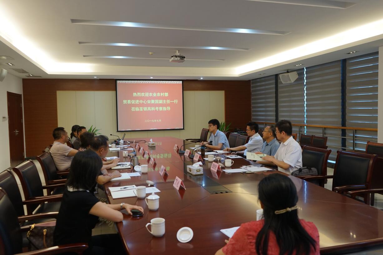 ??? 2019年7月9日,農業農村部農業貿易促進中心宋聚國副主任一行蒞臨荃銀高科調研指導,省農委外事外經處處長韋艾平、調研員閆玉平等陪同調研。荃銀高科副董事長、總經理張琴,副總經理江三橋等熱情接待了宋聚國副主任一行。