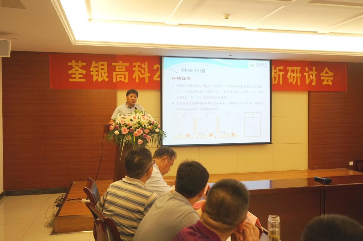 ??? 會上,公司副總經理、首席技術官、荃銀農科院院長張從合先生作荃銀高科科研發展規劃報告,回顧和總結了公司科研成果成效,規劃了未來科研發展方向和育種目標。公司始終堅持科技創新,注重科企合作,培育優良品種,為公司持續發展不斷注入新動力。